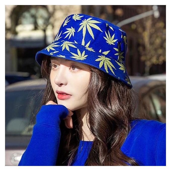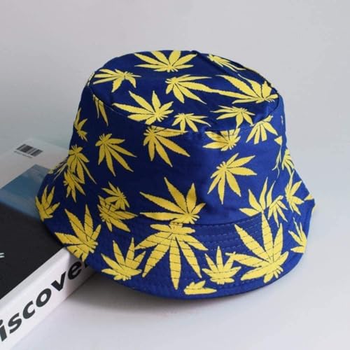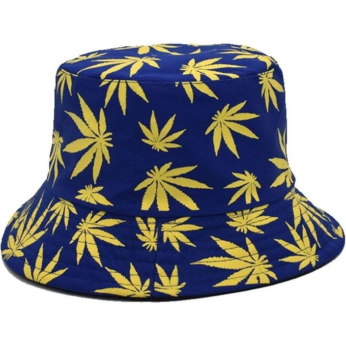 Generic - قبعة دلو أزرق داكن بنقشة أوراق صفراء، قطن، مقاس موحد