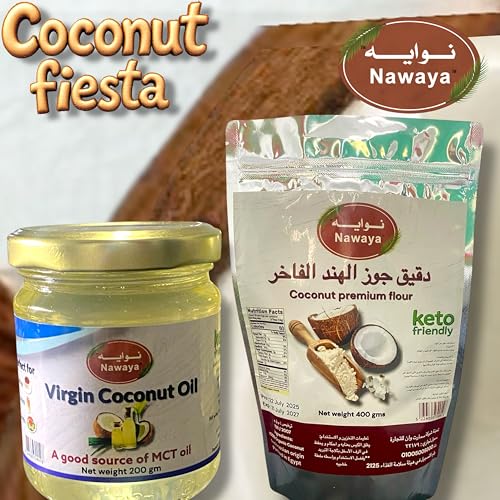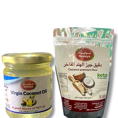 - محتويات المنتج: تتضمن العبوة 400 غرام من دقيق جوز الهند الفاخر و200 غرام من زيت جوز الهند البكر من العلامة التجارية نوايا