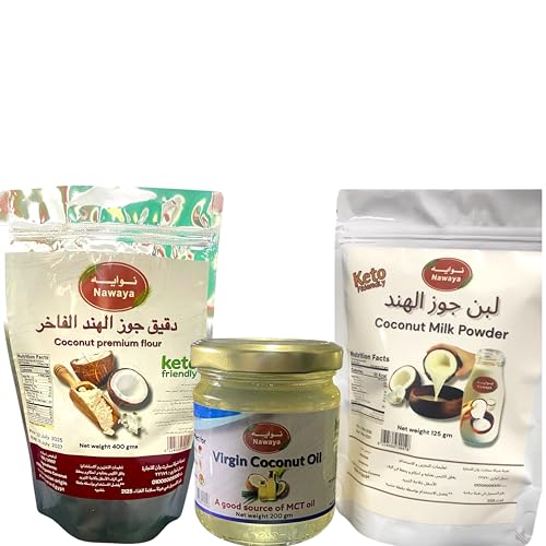 Generic - مجموعة جوز هند صديقة للكيتو من نوايا، زيت بكر 200 غرام، مسحوق حليب 120 غرام، دقيق ممتاز 400 غرام، غني في MCT