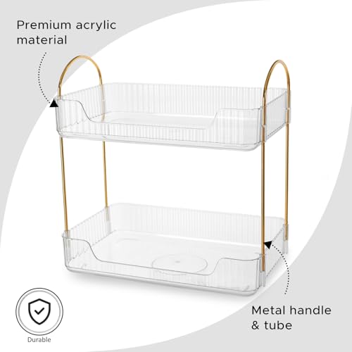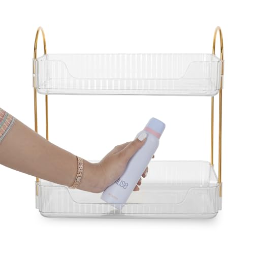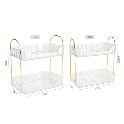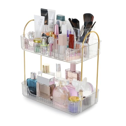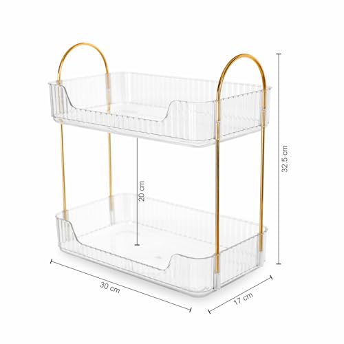 Nayasa - منظم المكياج البلاستيكي الصغير ثنائي الطبقات لتخزين أدوات التجميل والمكياج والمجوهرات ومنتجات العناية بالبشرة، رف تخزين للاستخدامات المتعددة مناسب للحمام وغرفة النوم وطاولة الزينة من نايسا، شفاف