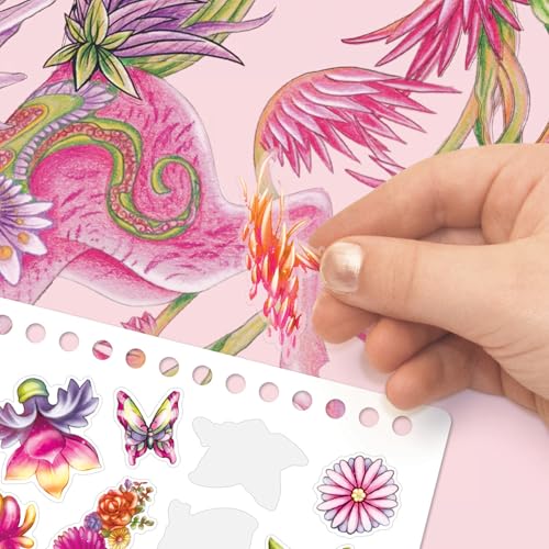 - تتضمن المجموعة 35 صفحة رسم وردية، و80 استنسل، و4 نماذج طباعة بالفرك، و250 ملصق، و12 قلم تلوين، و12 تقنية من تقنيات الرسم.