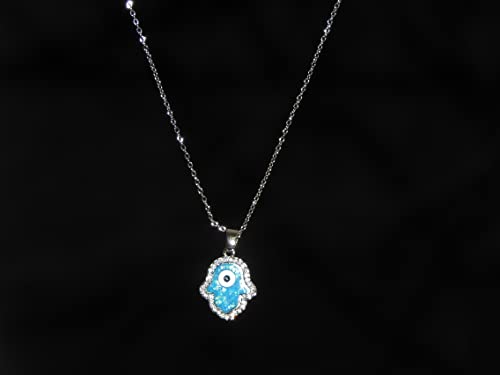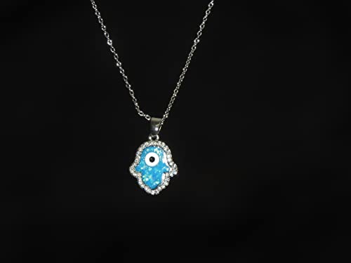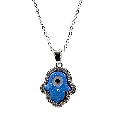 Generic - سلسلة همسة بدلاية على شكل كف وعين الحسد مصنوعة من اوبال ازرق صناعي مع فصوص زركون - ستانلس ستيل, 45، للنساء