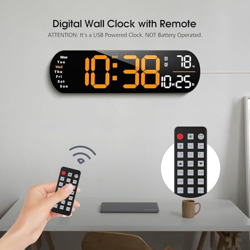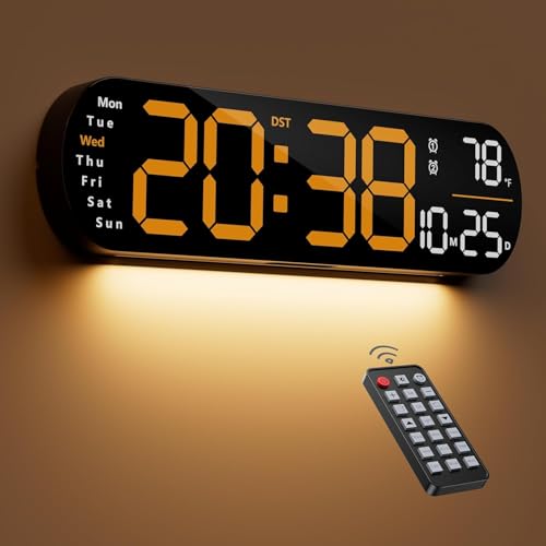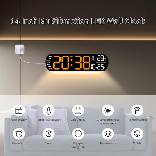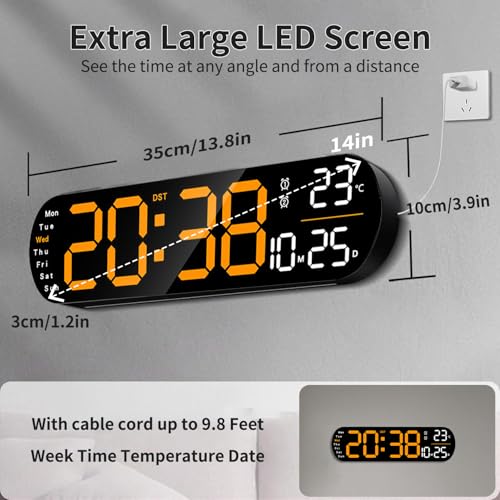 Necomi - ساعة حائط رقمية بشاشة عرض كبيرة 14 بوصة ومنبه، مع جهاز تحكم عن بعد وإضاءة محيطة، حساسية إضاءة تلقائية بعشر سرعات، ساعة رقمية بإضاءة ليد مع عرض التاريخ والأسبوع ودرجة الحرارة من نيكومي (برتقالي)