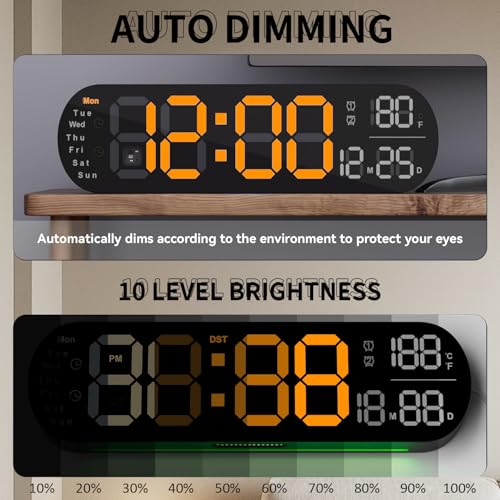 - [مخفت إضاءة تلقائي بعشر مستويات لدرجة السطوع]: مع 10 مستويات لدرجة السطوع قابلة للتعديل، يمكنك ضبط درجة السطوع المريحة يدويًا بسهولة باستخدام جهاز التحكم عن بعد. تحتوي ساعة إضاءة ليد على مستشعر تخفيت تلقائي مدمج، ويمكنها أيضًا ضبط درجة السطوع تلقائيًا مع تغير الإضاءة، مما يوفر لك احتياجاتك بذكاء. إذا شعرت أنها ساطعة جدًا، يمكنك أيضًا إيقاف تشغيل الشاشة.