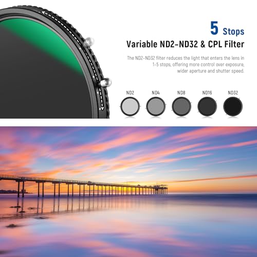 - 【فلتر ان دي وسي بي ال متغير】بعد ضبط فلتر ان دي ثم تدوير الإطار، يمكنك تحقيق وظائف فلتر ان دي وفلتر سي بي ال في نفس الوقت. تتيح لك مجموعة الفلتر 2 في 1 التصوير في ظروف الإضاءة الساطعة لالتقاط صور ضبابية الحركة. يقلل من الانعكاسات والوهج الناتج عن الأشياء اللامعة مثل الماء أو الزجاج. يقلل فلتر الكثافة المحايدة المتغيرة من 1 إلى 5 توقفات من الضوء.