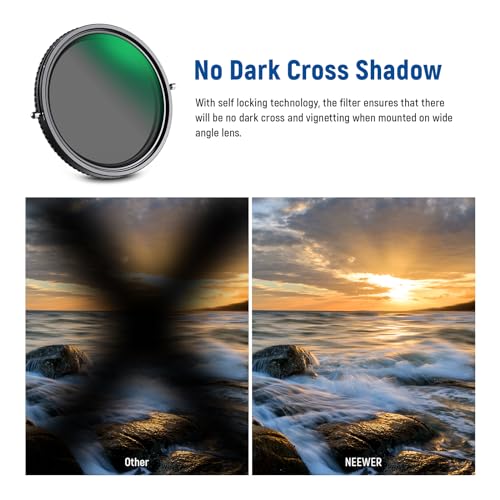 - 【لا يوجد ظل متقاطع غامق】لحل مشكلة التظليل المعروفة جيدًا باستخدام فلاتر ان دي المتغيرة عند استخدامها على العدسات ذات الزاوية الواسعة، تستخدم مجموعة فلتر نيوير تقنية القفل الذاتي لضمان عدم وجود ظل متقاطع غامق أو تظليل عند التصوير بعدسة واسعة الزاوية.