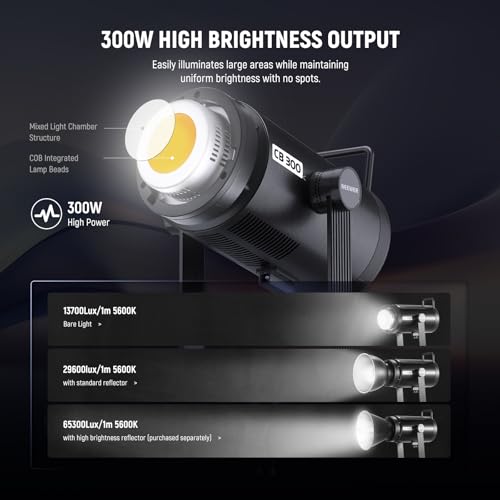- 【مصباح فيديو سي او بي قوي 300 واط】 ينتج CB300C مع مخرج 300 واط إضاءة رائعة تصل إلى 29600 لوكس عند 1 متر (يستخدم مع العاكس المتضمن)، يتضمن تقنية سي او بي التي تضمن اختراقًا قويًا للضوء وتوزيعًا متساويًا. تتكيف درجة حرارة اللون الواسعة من 2500-7500 كلفن مع تعتيم خالٍ من الوميض بنسبة 0-100% مع ظروف الإضاءة المختلفة، في حين أن CRI97+/TLCI 97+ يلتزم بإعادة إنتاج الألوان بشكل مخلص. قيمة DUV الدقيقة و+/-50 جرام تجعل تعديلات النغمة سهلة ودقيقة