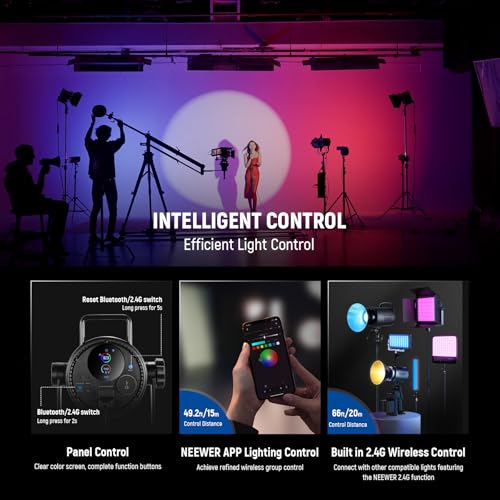 - 【تطبيق / تحكم لاسلكي 2.4 جيجاهرتز】 قم بتحميل تطبيق نيوير واستخدم تقنية انفينيتي للتحكم في وقت واحد حتى 256 مصباحًا في نطاق 49.2 قدم/15 متر. يوفر نظام 2.4 جيجا المدمج 99 قناة، مما يسمح بضبط أضواء متعددة على نفس القناة لإدارة المجموعة في نطاق 66 قدم/20 متر. يمكن لأي من المصابيح أن يعمل كجهاز تحكم عن بعد لمزامنة التغييرات عبر المصابيح الأخرى. شاشة ملونة مع أزرار الوظائف تظهر بوضوح إعدادات الوقت الحقيقي لسهولة الرجوع إليها في أي وقت