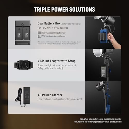- 【يدعم إمدادات طاقة متعددة】 مرفق مع صندوق بطارية، يمكن تشغيل MS60B على بطارية واحدة أو بطاريتين NP-F750/NP-F970 للإضاءة أثناء التنقل. يمكن أيضًا تشغيل المصباح ببطارية مثبتة على شكل V (14.4 فولت) وكابل دي تاب (كلاهما يباع بشكل منفصل). يتيح لك محول طاقة التيار المتردد توصيل الضوء بمقبس الحائط للتشغيل المتواصل. ملاحظة: لا يمكن شحن البطاريات أثناء استخدامها. يرجى استخدام بطارية مثبتة على شكل V أو محول الطاقة للحصول على أقصى خرج للطاقة