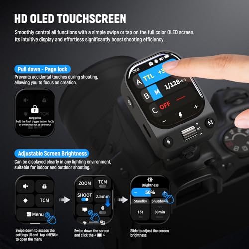 - 【مشغل فلاش يعمل باللمس】 يتميز مشغل الفلاش اللاسلكي بشاشة لمس قابلة للتعتيم مع عناصر تحكم بديهية، يدعم الفلاش التلقائي تي تي ال، مزامنة اتش اس اس 1/8000 ثانية، التحكم في مصباح النمذجة، التحكم في المجموعة، إلخ. ملاحظة: قم بتعطيل وضع الاتصال الفردي لـ TTL و Strobe