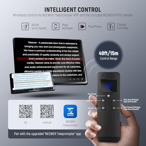 - 【جهاز تحكم ذكي عن بعد】 تحكم عبر جهاز التحكم عن بعد RT113 المتضمن (بطاريات AAA غير متضمنة) وتطبيق نيوير Teleprompter. قم بإقران جهاز التحكم عن بعد مع التابلت الخاص بك في التطبيق عبر اتصال بلوتوث أو وصلة بلوتوث مباشرة. ما عليك سوى النقر على الأزرار الهادئة للتشغيل/الإيقاف المؤقت وضبط سرعة التمرير وتشغيل صفحات البرنامج النصي وتغيير حجم الخط. التطبيق متوافق مع نظام التشغيل iOS 11.0 واندرويد 6.0 والإصدارات الأحدث