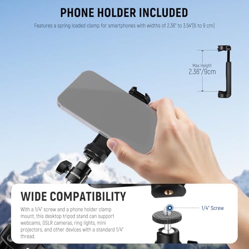 - 【حامل سطح المكتب صغير الحجم ومحمول】 خفيف الوزن وقابل للطي، حامل ثلاثي القوائم صغير ST45B للكاميرا مع حامل موبايل متوافق مع آيفون سهل التخزين أو الحمل أثناء السفر. معدات تصوير مثالية لحمل موبايلك أو بث كاميرا الويب فوق المكتب للبث المباشر ومؤتمرات الفيديو ومكالمات التكبير وصور السيلفي والتدريس عبر الإنترنت ودروس المكياج وإنشاء محتوى الوسائط والعمل عن بعد وغير ذلك الكثير.