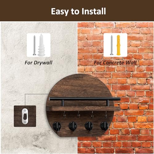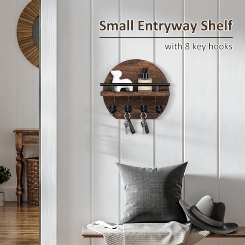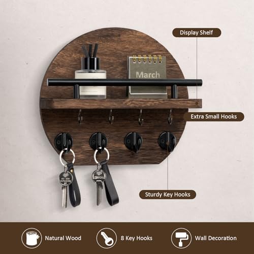 Nekon - نيكون حامل مفاتيح للحائط - ديكور حائط شقة 9.8 انش مع رف و8 خطافات للمفاتيح شماعة خشبية دائرية لديكور المنزل بني