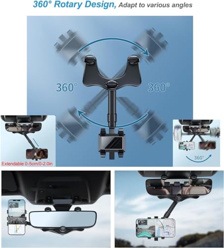 - ✅حامل دوار 360 درجة لمراية الصالون للسيارة: يتميز حامل الهاتف للسيارة بتصميم رائع قابل للتعديل بزاوية 360 درجة. يمكنك تدوير حامل الهاتف في السيارة إلى ✅أي زاوية للحصول على أفضل زاوية رؤية. يمكن رسم طول الذراع حوالي 0-3 سم بدون التأثير على خط الرؤية.