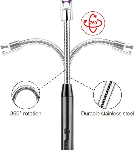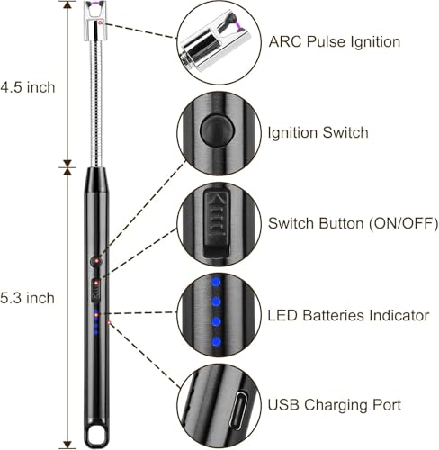 - 【اقتصادية】لا يحتاج إلى غاز، ولا يحتاج إلى سائل، ولا لهب. تحتوي هذه الولاعة الطويلة على مؤشر شحن LED يمكنك من خلاله رؤية الأداء المتبقي حتى تتمكن من شحنها في الوقت المناسب. يمكن تفريغ الشحن الكامل 60 مرة، ويمكن شحنه أكثر من 300 مرة.