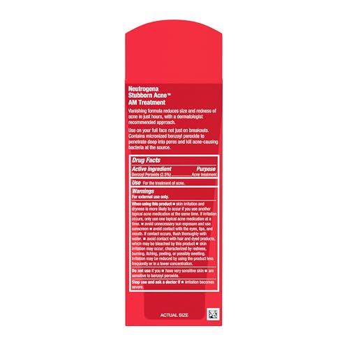 - 2 أونصة من نيوتريجينا Stubborn Acne AM - علاج بنسبة 2.5% بنزويل بيروكسايد يعمل طوال اليوم للمساعدة في القضاء على انتشار حب الشباب العنيد والاحمرار
