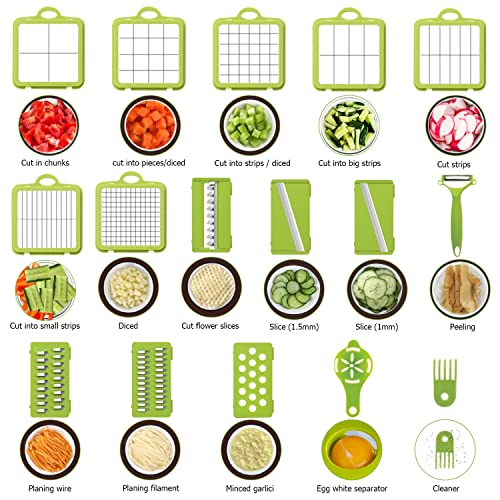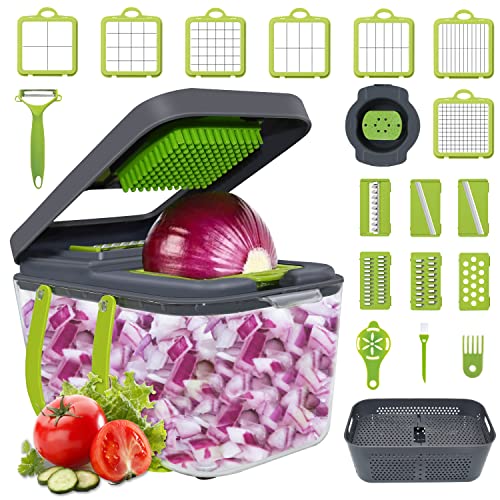 OuYteu - قطاعة خضروات وبصل 22 في 1 مع 14 شفرة من الفولاذ المقاوم للصدأ، قطاعة خضراوات قابلة للتعديل مع رف تصريف وحاوية تخزين، أداة مطبخ