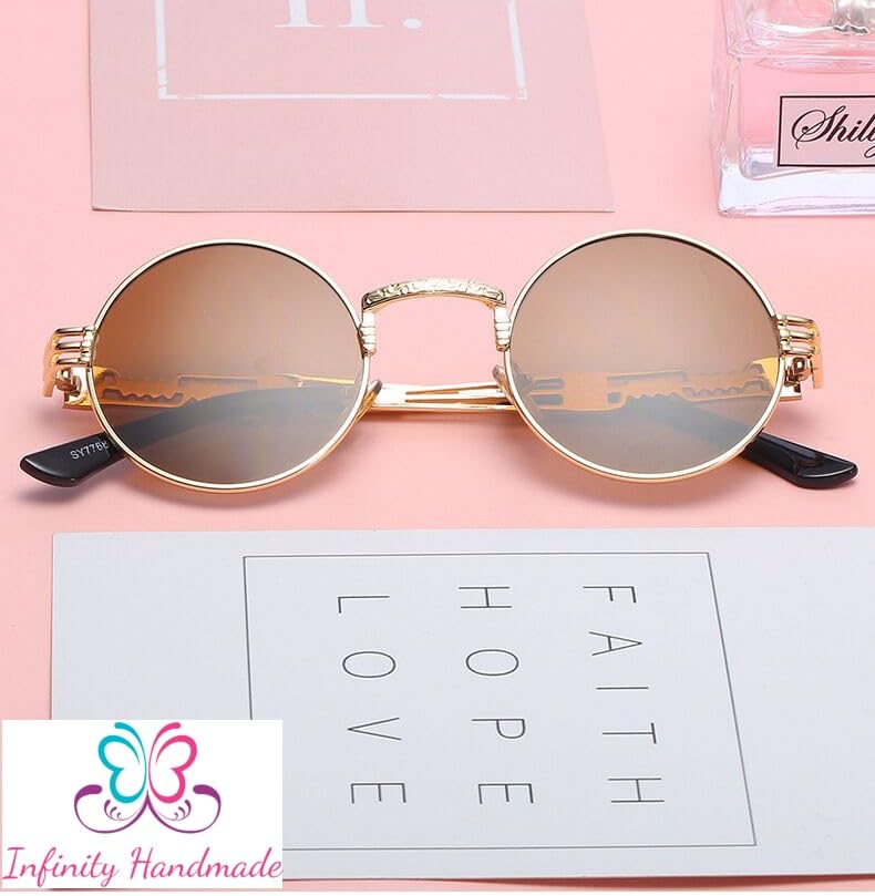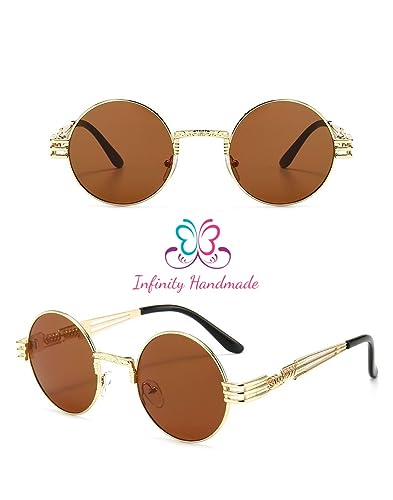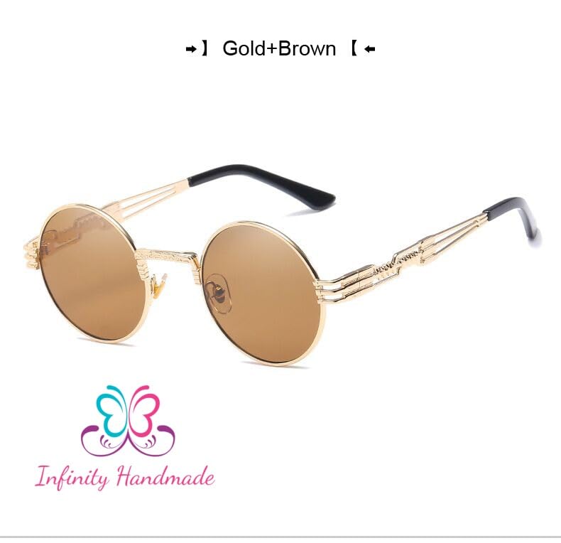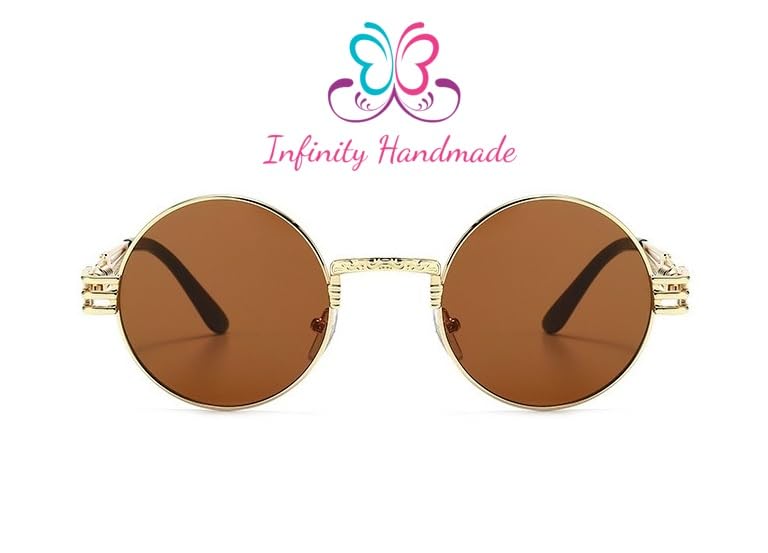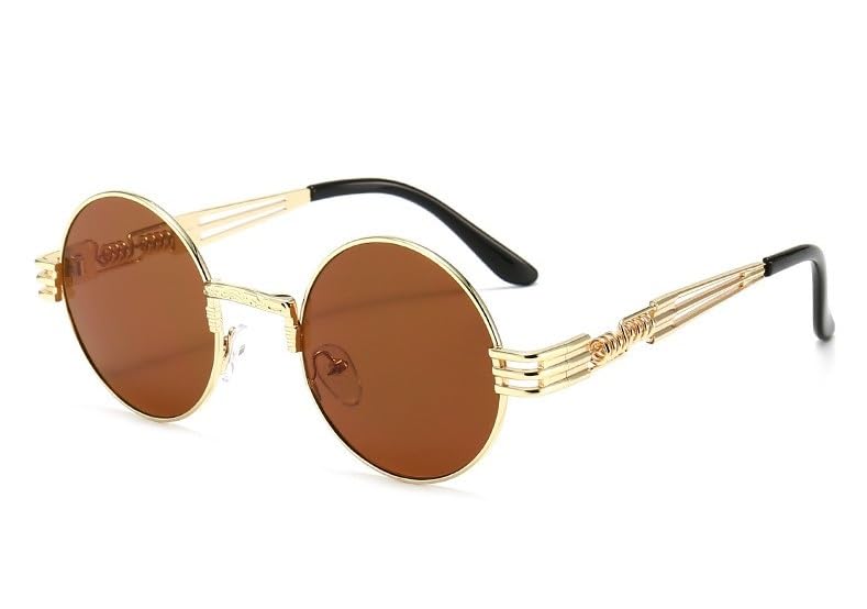 Generic - نظارات شمس دائرية معدنية بنمط ستيمبنك للرجال والنساء بأذرع زنبركية مزدوجة، عدسات ملونة بعامل حماية من الأشعة فوق البنفسجية UV400 بلون ذهبي وبني، صناعة يدوية