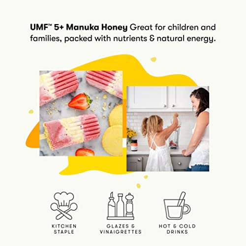 - طاقة طبيعية، رائع للأطفال والعائلات - عسل مانوكا UMF 5+ / ام جي او 83+ هو عسل مانوكا لذيذ وصحي يمكن لجميع أفراد العائلة الاستمتاع به. سيمنح العسل اللذيذ بنكهته النظيفة وقوامه الشبيه بحلوى الفدج الحيوية والنشاط لجميع أفراد الأسرة وسيجعلهم مستعدين لأي شيء