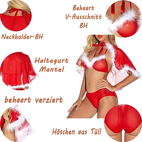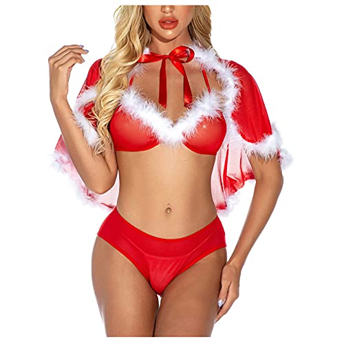 NewBull - ملابس داخلية مثيرة للنساء، طقم لانجيري احمر للكريسماس، حمالة صدر عميقة على شكل حرف V + بانتي تول + رداء قصير برباط، زي الكريسماس من ثلاث قطع، احمر، مقاس واحد