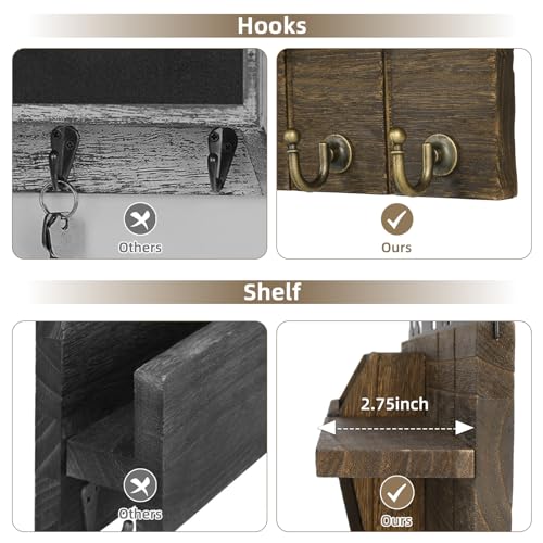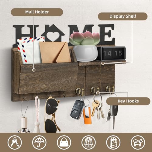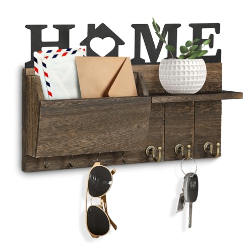 NEWHEY - حامل مفاتيح ومنظم بريد خشبي ريفي يثبت على الحائط مع رف عائم و7 خطافات مفاتيح للمدخل وغرفة النوم والمكتب من نيووي، لون بني