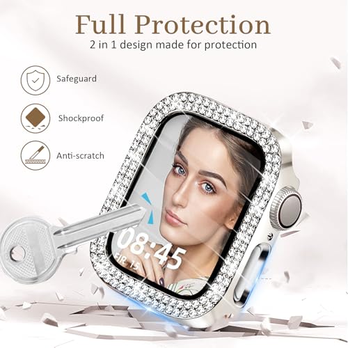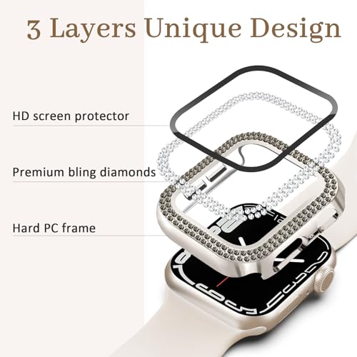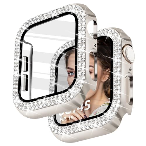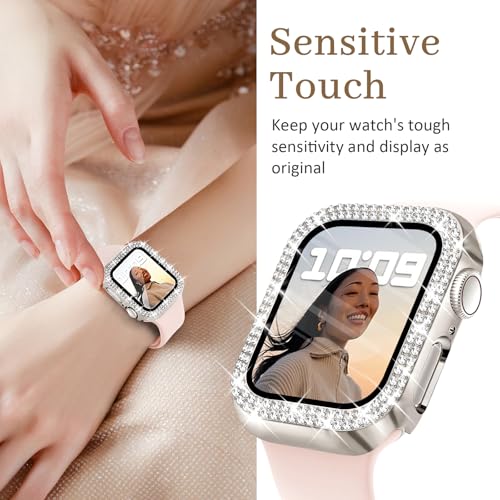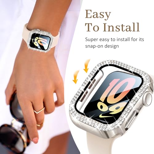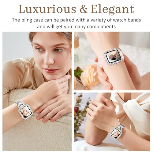 Newlibery - جراب لامع بتصميم ماسي للنساء من نيوليبيري، متوافق مع ساعة آبل 40 ملم 41 ملم 44 ملم 45 ملم، جراب صلب من البولي كربونات مع شاشة حماية من زجاج مقوى HD لسلسلة اي ووتش 4/5/6/7/8/9/SE