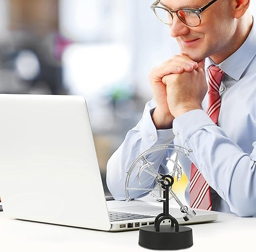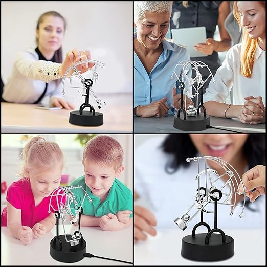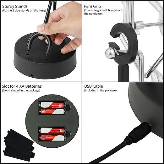 - مستمرة بفعل طاقة كهربائية منخفضة (ليست بندول نيوتن التقليدي بكرة تصطدم بأخرى، بل حركة دورانية فيزيائية).