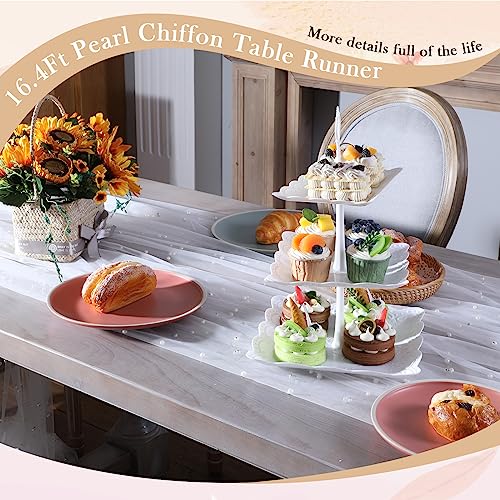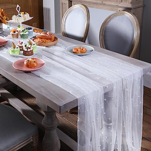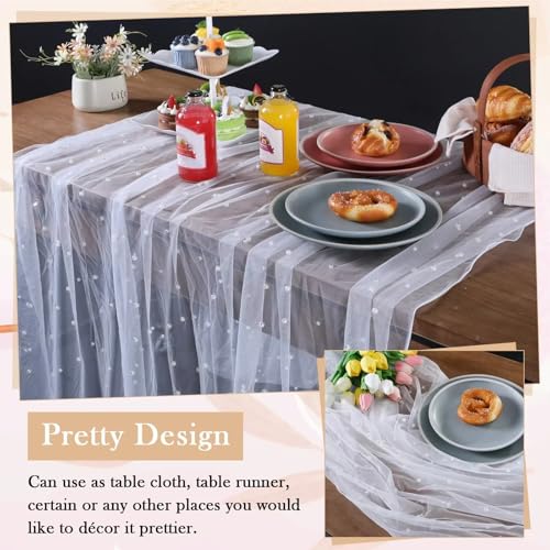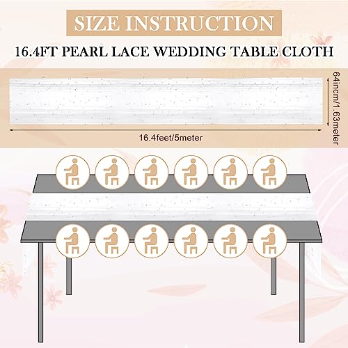 Newwiee - نيووي مفرش طاولة طويل بطول 16.4 قدم مزين باللؤلؤ الابيض، مفرش طاولة طويل من قماش التول الناعم والدانتيل والشيفون لحفلات اعياد الميلاد والحلوى