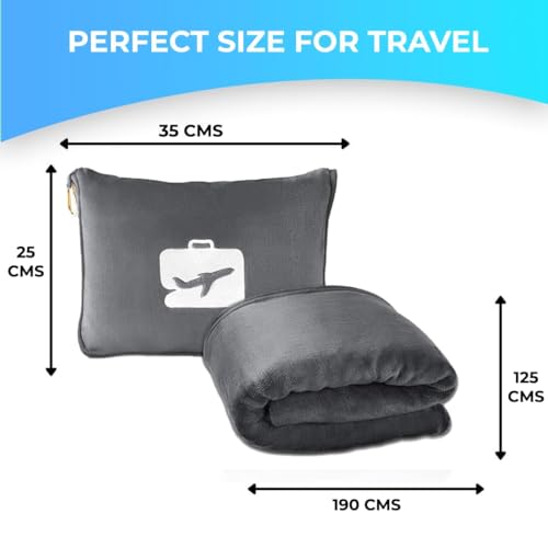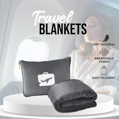 nexlev - بطانية ومخدة ناعمة 2 في 1 للسفر بالطائرة مع شنطة وكيس مخدة وحافظة بمشبك للتعليق على الظهر ومقبض السفر من نيكسليف رمادي البوليستر
