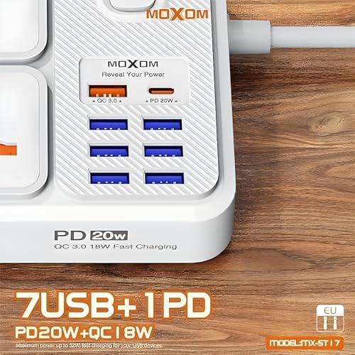 - منافذ USB وType-C PD: 7 منافذ USB 2.4A تتيح لك شحن الأجهزة المحمولة بكفاءة، بالإضافة إلى منفذ PD Type-C بقدرة 20W لشحن الأجهزة الحديثة بسرعة.