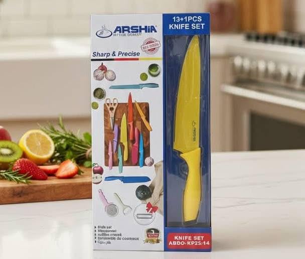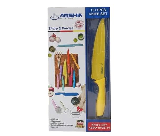 - [طقم متكامل 13+1]: يشمل الطقم مجموعة متنوعة من السكاكين بالإضافة إلى أدوات إضافية مثل المقص وقطّاعة العجين، لتلبية جميع احتياجات المطبخ اليومية.