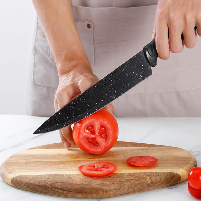 - [شفرات حادة تدوم طويلاً]: يتميز الطقم بشفرات حادة جدًا تضمن لك أداءً استثنائيًا في التقطيع، حيث تبقى السكاكين حادة لفترة طويلة حتى مع الاستخدام المتكرر. كما تأتي مبراة السكاكين المرفقة لتسهيل عملية شحذ الشفرات عند الحاجة، مما يحافظ على أداء الطقم وكفاءته العالية لسنوات طويلة دون فقدان الجودة.
