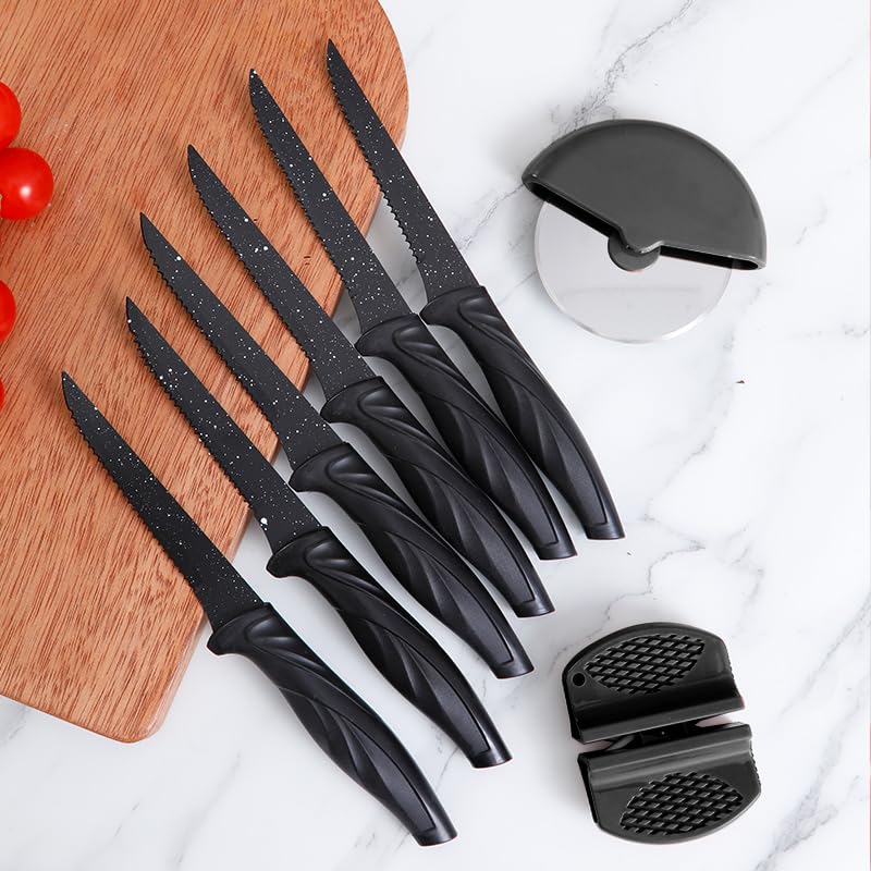 - [ساطور ومقص ومبراة وقاطع بيتزا]: الطقم لا يقتصر على السكاكين فحسب، بل يحتوي أيضًا على ساطور قوي الحجم لتقطيع اللحوم، مقص متعدد الاستخدامات للمطبخ، مبراة احترافية لتجديد حدة الشفرات، وقاطع بيتزا مريح الاستخدام. كل أداة مصممة بعناية لتجعل مهام المطبخ اليومية أسرع وأسهل وأكثر دقة.