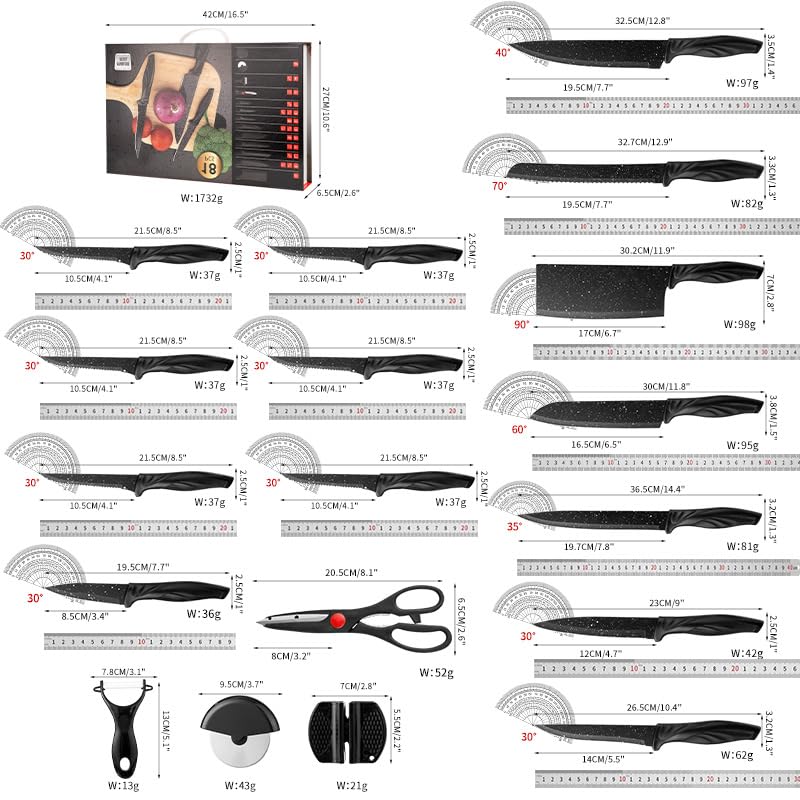 Next store - طقم سكاكين 18 قطعة من الستانلس ستيل بجودة عالية شفرات حادة وساطور ومقص ومبراة وقاطع بيتزا تصميم أنيق ومتكامل للمطبخ من Next Store