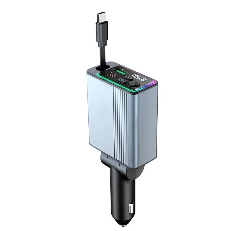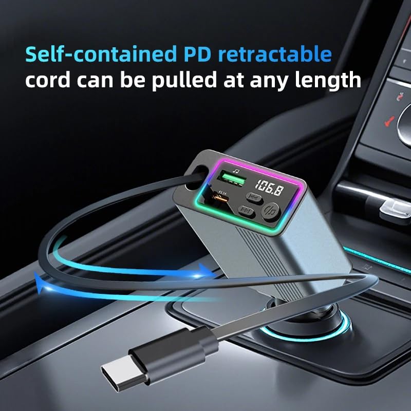 Next store - شاحن سيارة بلوتوث 48 واط من Next store مع كابل تايب سي مدمج حلزوني ومنفذ يو إس بي للشحن السريع، جهاز إرسال FM ومشغل موسيقى لـ سامسونج جالاكسي S24 S23 الترا وآيفون 15 14 بيكسل 8