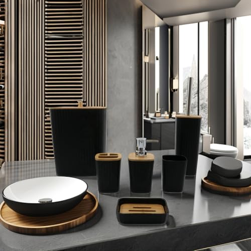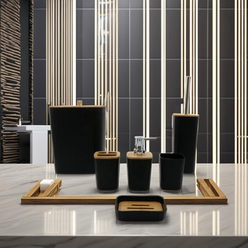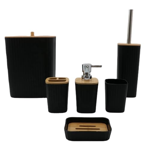Next store - طقم حمام متكامل 6 قطع من Next Store، غطاء خشب بامبو أنيق، يشمل حاوية مهملات، فرشاة تواليت مع حاملها، ديسبنسر صابون سائل، حامل فرش أسنان، كوب، وصابونة (اسود)