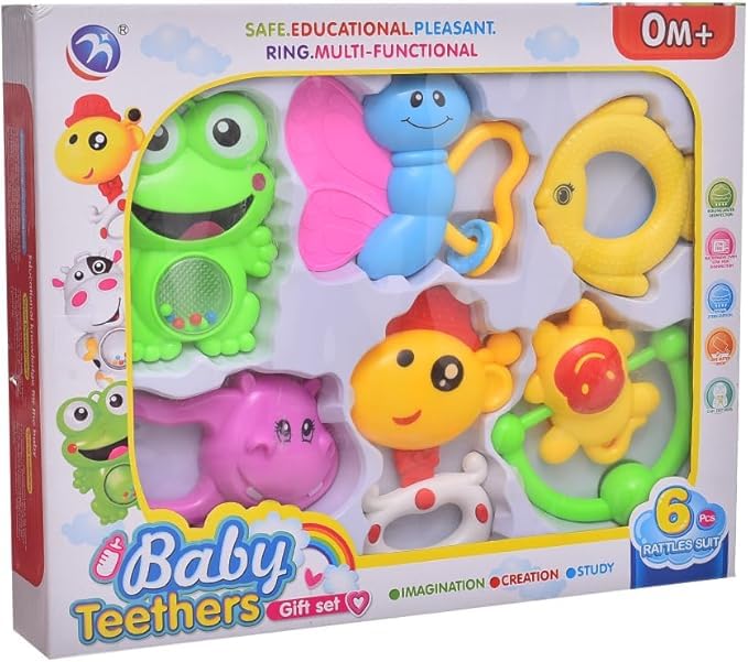 Next store - طقم شخشيخة بلاستيكية للأطفال من Next Store، مكون من 6 قطع بأشكال متعددة وألوان زاهية، يساعد على تنمية الحواس والمهارات الحركية للأطفال الصغار.