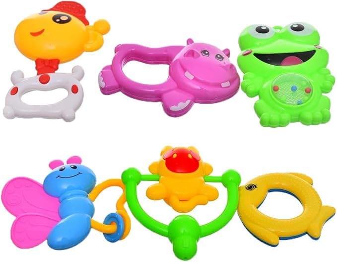 - [ مجموعة شخشيخات متعددة الأشكال ]:: يتضمن الطقم 6 شخشيخات بأشكال وأحجام مختلفة، مما يمنح الطفل تجربة لعب متنوعة ومسلية.