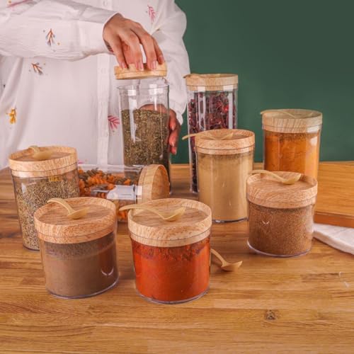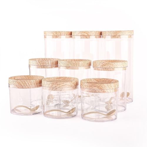 Next store - طقم بقوليات 9 قطع من الأكريليك الشفاف من Next store – علب تخزين محكمة الغلق متعددة الأحجام لتخزين البقوليات والتوابل والبهارات بتصميم أنيق بغطاء خشبي