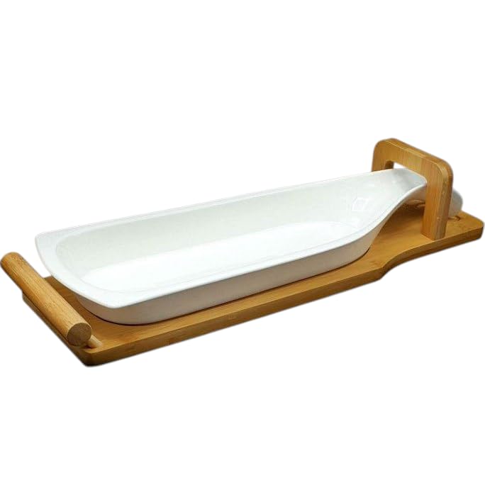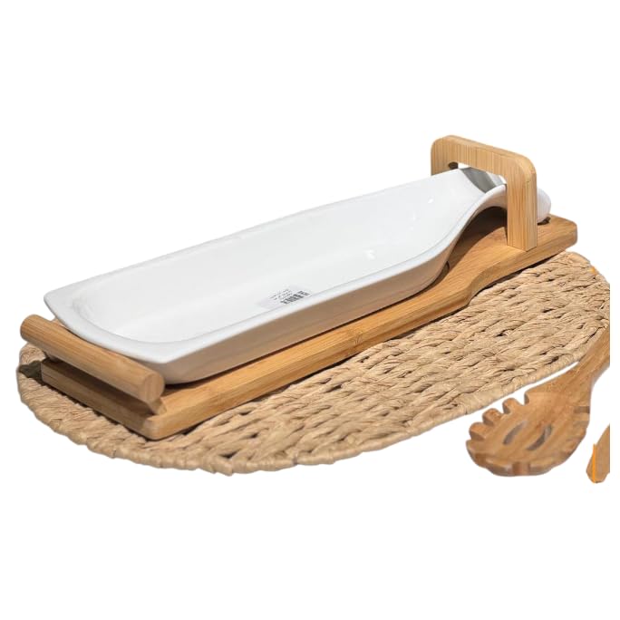 - [تصميم أنيق ومميز:] يتميز الطبق بتصميم يجمع بين الخشب الطبيعي الدافئ والسيراميك اللامع الفاخر، مما يمنح مائدة التقديم لمسة من الرقي والفخامة في كل مناسبة.