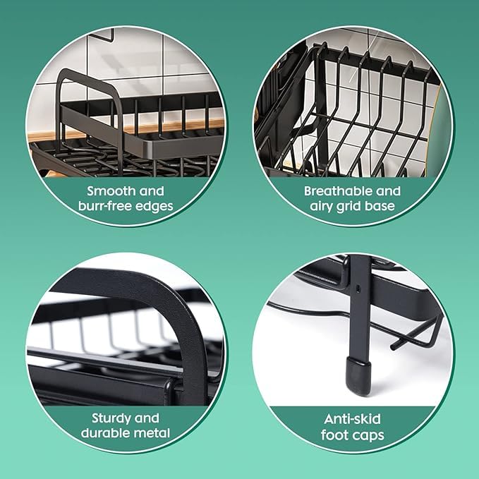 - [سطح مقاوم للخدش] : تم تصنيع الرف من مواد متينة بلمسة نهائية بنمط مصنفر أنيق، تمنحك مظهرًا عصريًا وتحمي أدوات المائدة من الخدوش والاحتكاك أثناء التجفيف والاستخدام اليومي.