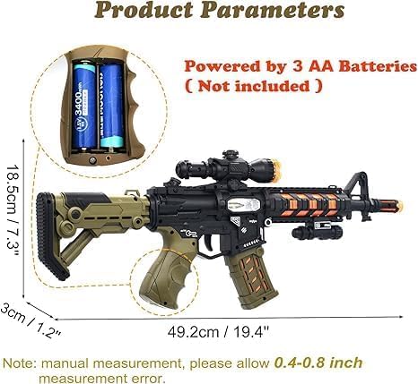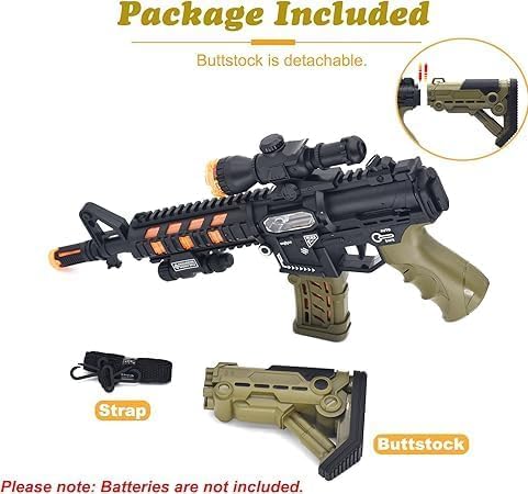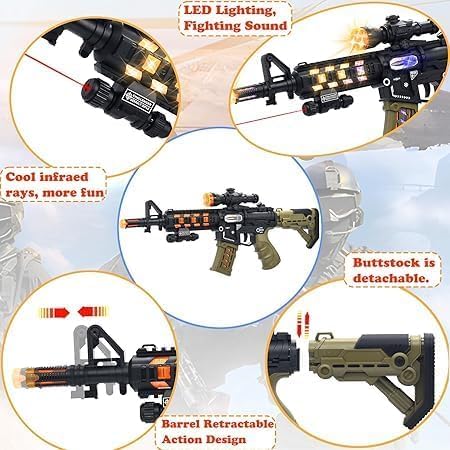 - [مؤثرات ضوئية وصوتية مبهرة:] يأتي المسدس بتأثيرات ضوئية جذابة وصوت قتال واقعي يعزز من أجواء اللعب ويمنح الأطفال تجربة تفاعلية مشوقة.