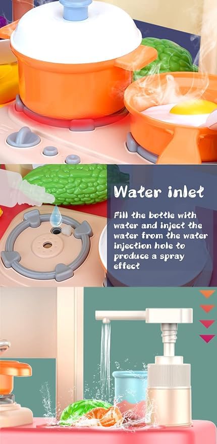 - [تصميم واقعي مع حنفية مياه : ] تتميز هذه اللعبة بتصميم واقعي يحاكي المطبخ الحقيقي، حيث تحتوي على حنفية مياه تعمل بشكل ممتع وآمن للأطفال. يمكن للأطفال تشغيل المياه وإغلاقها، مما يعزز مهاراتهم في المحاكاة والتفاعل. هذا يضيف متعة وواقعية للتجربة، ويشجع على اللعب التخيلي والإبداعي.