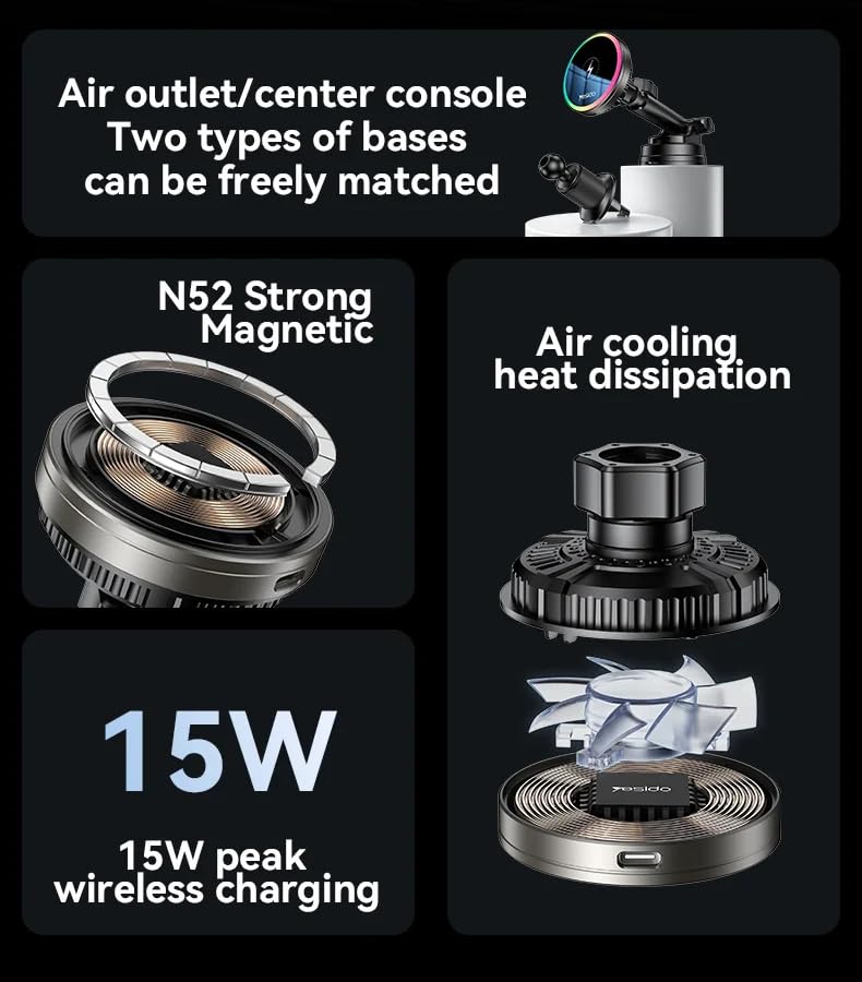 Next store - حامل هاتف مغناطيسي للسيارة من Next Store، شحن لاسلكي سريع 15 وات، تبريد هوائي، تركيب على فتحة التكييف أو الكونسول، تثبيت آمن، دوران 360 درجة، ملحق عملي للهواتف