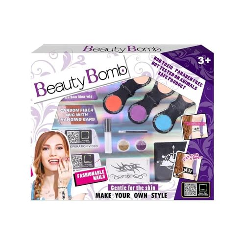 - لعبة تجميل متكاملة للبنات تشمل مجموعة متنوعة من أدوات التجميل مثل المكياج الآمن للأطفال، باروكة ملونة، صبغة شعر مؤقتة، ووشوم مرحة.