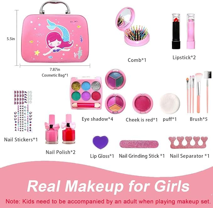 Next store - مجموعة مكياج من Next Store للبنات الصغيرات، مجموعة مكياج مع شنطة مستحضرات تجميل لطيفة، لعبة مكياج قابلة للغسل، هدايا للاطفال للاميرة الصغيرة