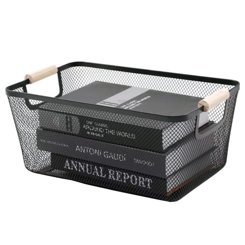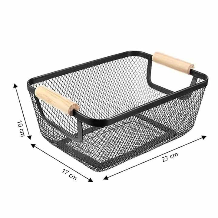 - [تصميم معدني متين :] سلة مصنوعة من معدن قوي مع مقابض خشبية، تجمع بين المتانة والأناقة لتخزين وتنظيم مختلف الأغراض بأمان.