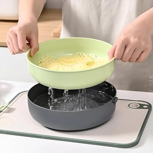 - سلة غسيل وتصفية مدمجة: يتميز الوعاء السفلي بوجود سلة مثقبة (مصفاة) داخلية، مما يتيح لكِ غسل الخضروات وتقطيعها وتصفيتها من الماء مباشرة في نفس الوعاء دون الحاجة لاستخدام أدوات خارجية.