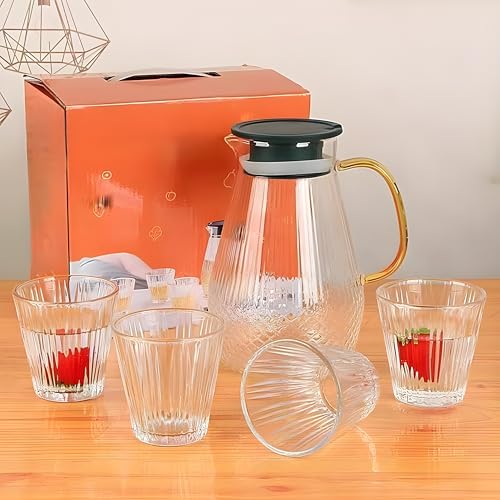 - طقم متكامل يضم دورق زجاج شفاف عالي الجودة مع أربع أكواب، مثالي لتقديم العصائر والمشروبات الباردة والساخنة في المنزل أو أثناء العزومات اليومية