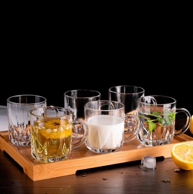 - [طقم مكون من 6 قطع]: يضم الطقم 6 أكواب زجاجية متناسقة الشكل والحجم لتلبي احتياجات العائلة والضيوف. مناسب للعزائم أو الجلسات اليومية ليمنح طاولتك مظهرًا موحدًا يعكس الذوق الرفيع والأناقة في كل مرة.